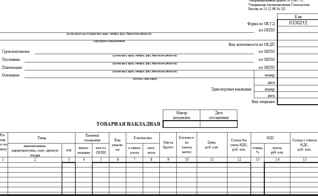 Товарная накладная ТОРГ-12 – это первичный учётный документ, который оформляют при передаче товаров или других материальных ценностей от продавца к покупателю. Единый бланк был утверждён Постановлением Госкомстата России от 25 декабря 1998 года № 132. Документ используют при продаже или передаче товарно-материальных ценностей другой организации. На основании накладной продавец списывает проданные товары, а покупатель принимает их к учёту.