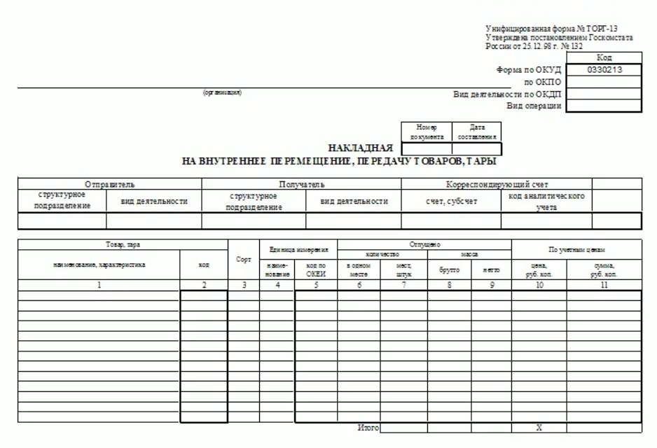 Унифицированная форма ТОРГ-13 была утверждена Постановлением Госкомстата РФ от 25.12.1998 № 132. С 2013 года её применение не является обязательным, но многие компании продолжают использовать её из-за удобства и наличия всех необходимых реквизитов.